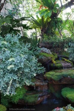 Growing in an arching mound that reaches 3 to 4 feet tall and 4 to 5 feet wide, the Woodlanders Blue Zenobia is ideal for use as an accent, in groupings or in mass plantings in sunny to partly shady areas of the landscape. It’s arching dusty grey-blue foliage provides wonderful contrast of color when combined with plants that have dark color.